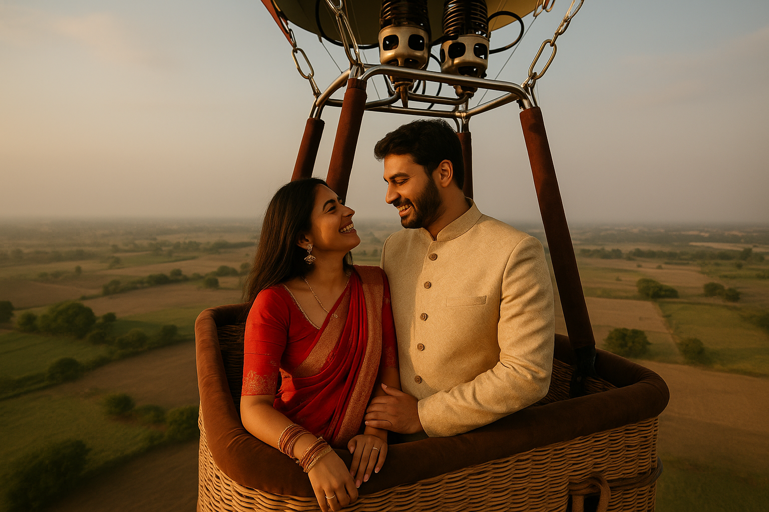 A ride in the sky during sunrise or sunset gives stunning wide-angle frames. The background of clouds and open air feels magical and dreamy. It is ideal for couples who love adventure and unique pre wedding photoshoot themes.