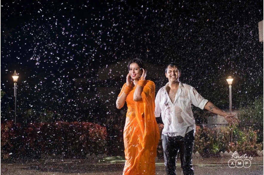 Rain adds emotion, movement, and a hint of drama to your pictures. Holding an umbrella together or dancing in the drizzle makes for playful and heartfelt photos. It is one of the most romantic pre wedding shoot themes loved by many couples.