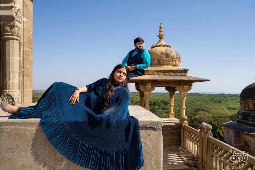 The vast open sands of Rajasthan create a dramatic setup for your pictures. As the sun sets, the golden tones of the dunes reflect beautifully on your skin. It is a perfect pre wedding shoot theme for couples who love grand and cinematic frames.