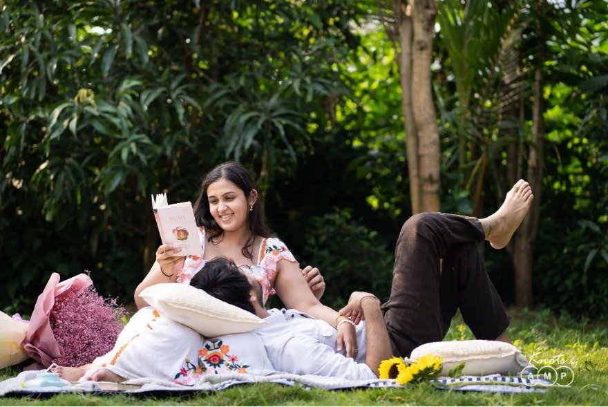 This idea is simple and full of charm. Imagine sitting under a tree with a basket of fruits and flowers while the sunlight filters through the leaves. A picnic shoot feels relaxed, fun, and natural, perfect for couples who want something light and joyful.