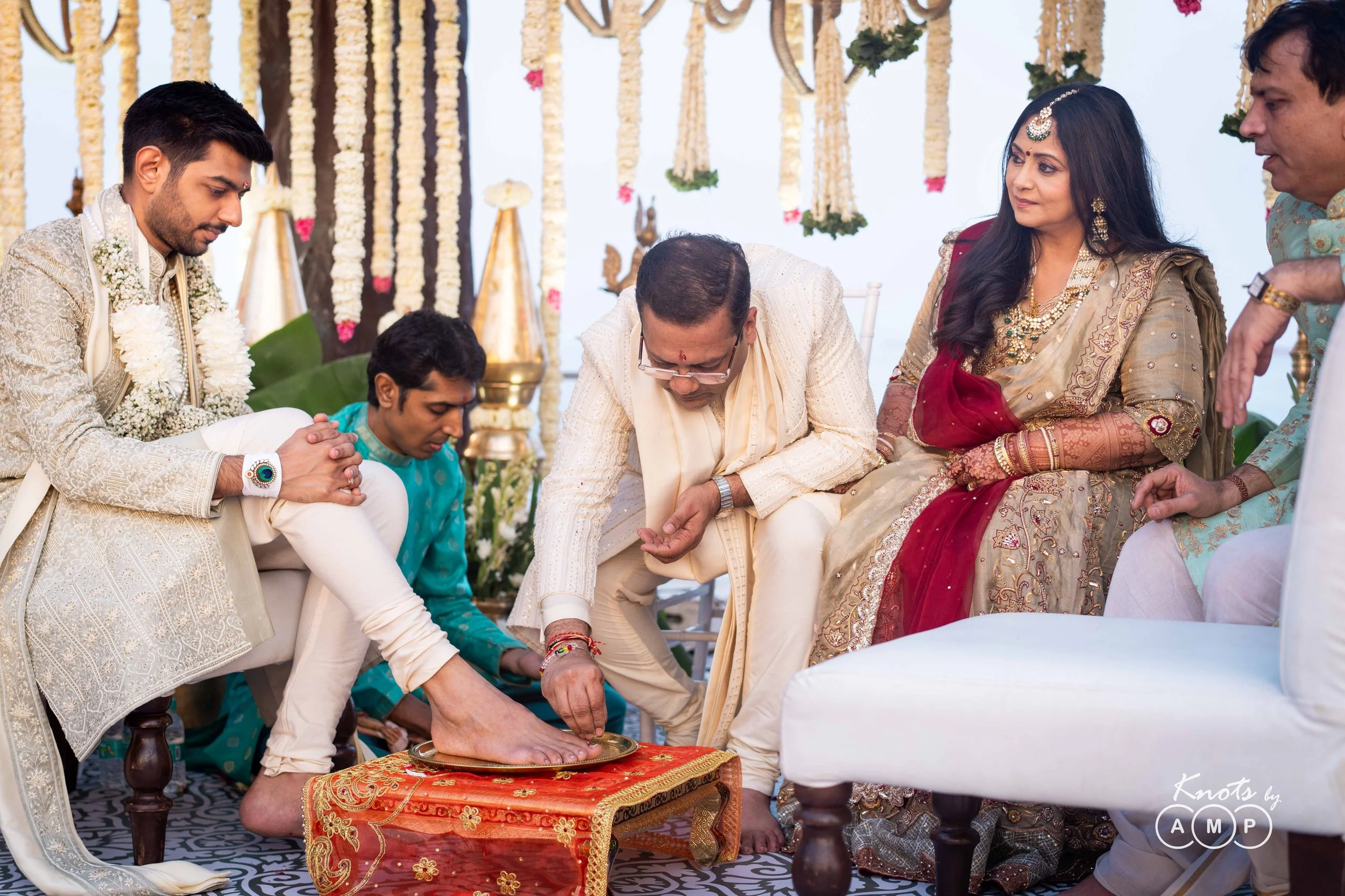 As the groom arrives at the mandap, the bride’s parents wash his feet and offer him a mixture of honey, ghee, and curd. This is known as the Madhuparka, a ritual of honour and respect. The Ponkhnu, where the bride’s mother playfully pulls the groom’s nose, adds a fun and light moment, reminding him to always stay humble.